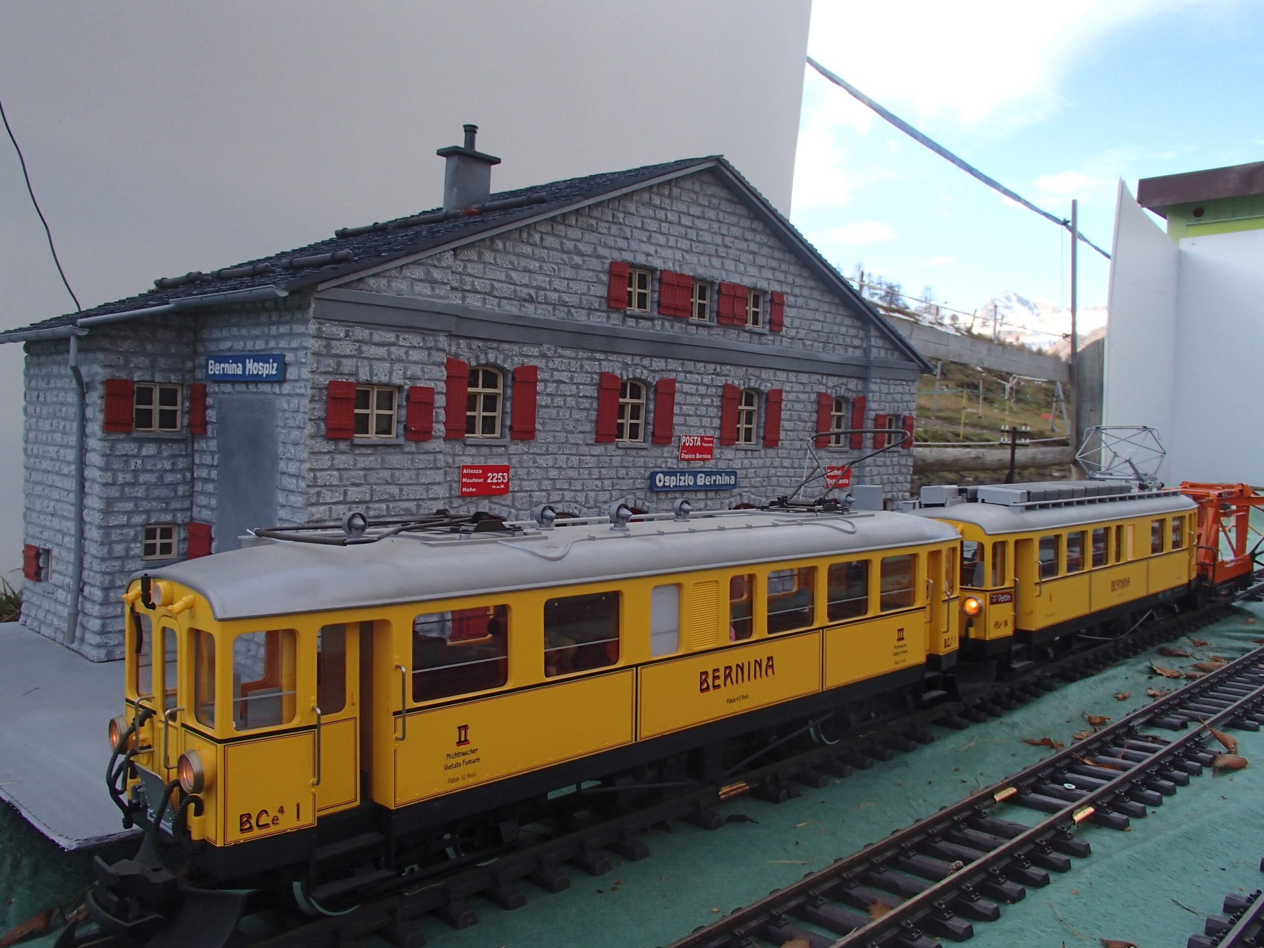 Dieser gelb lackierte Nostalgie-Triebwagen ist eine Nachbildung der Elektrotriebwagen, die auf der Berninastrecke zum Einsatz gekommen sind.